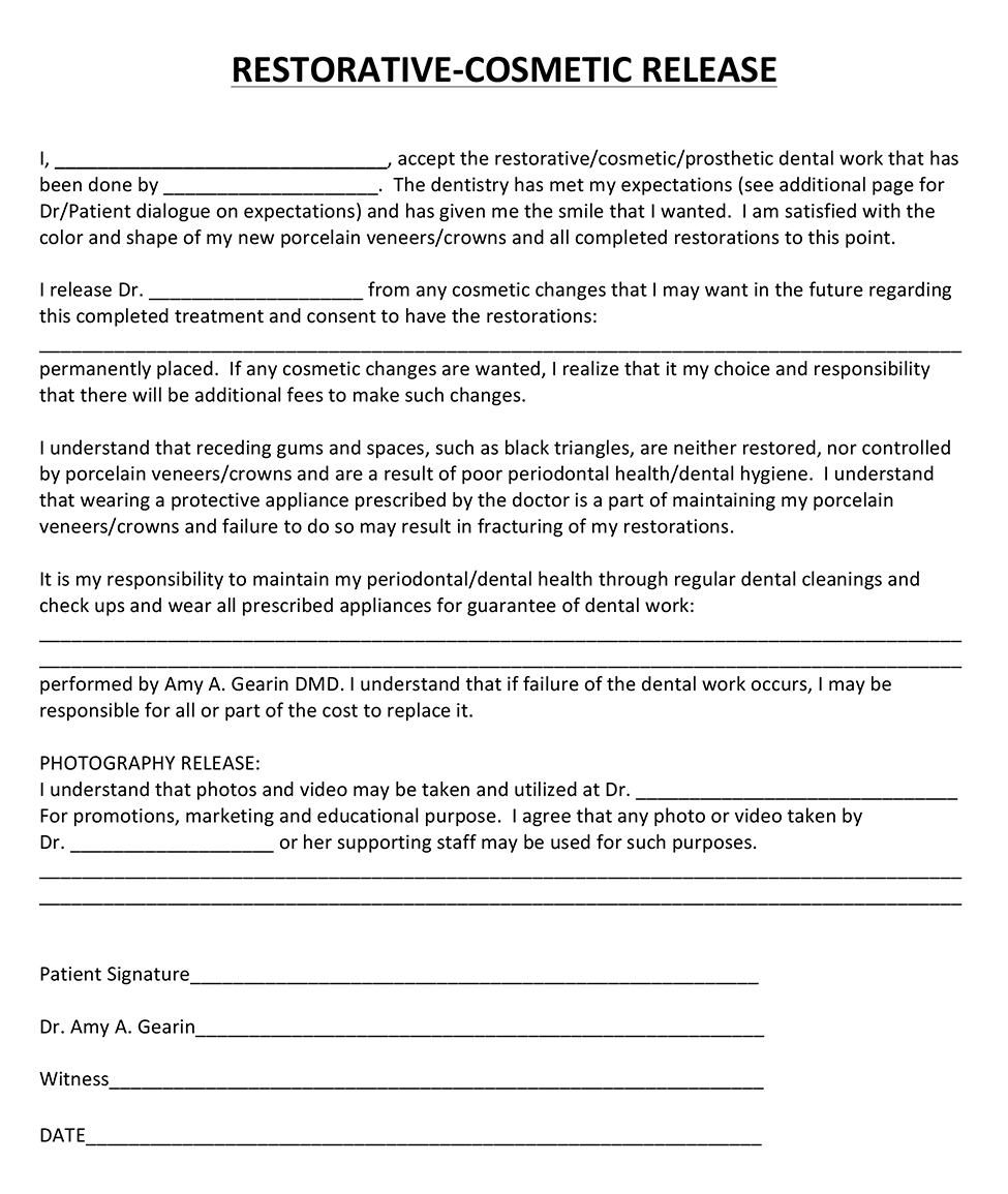 • Statement of Release. The document releases the dental office from any cosmetic changes in the future.